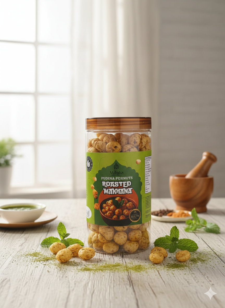 Refresh your snacking with the cool burst of mint! Milato’s Pudina Roasted Makhana combines crunchy foxnuts with aromatic herbs and spices, creating a refreshing, flavorful snack that’s light yet satisfying. Perfect for tea-time or on-the-go munching.